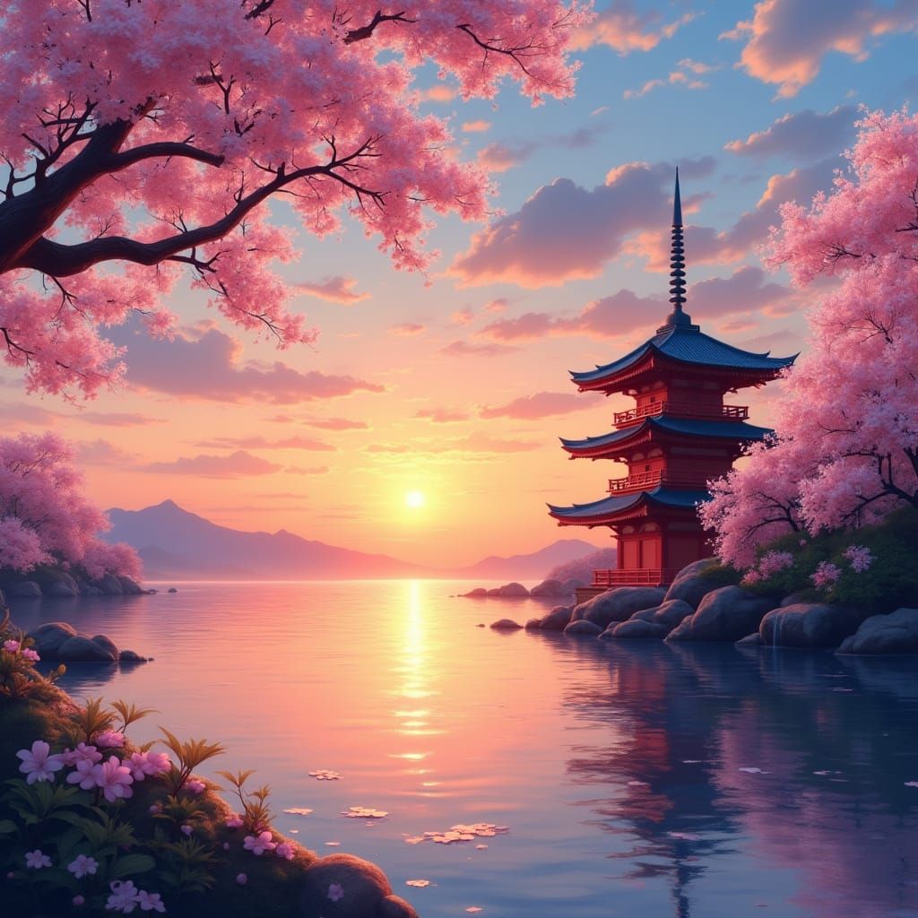 This image depicts a romantic sunset over tranquil waters, featuring a Japanese pagoda against a vibrant sky. Blooming cherry blossoms add to the soft, warm, and dreamy atmosphere, rendered in a style reminiscent of Impressionism.