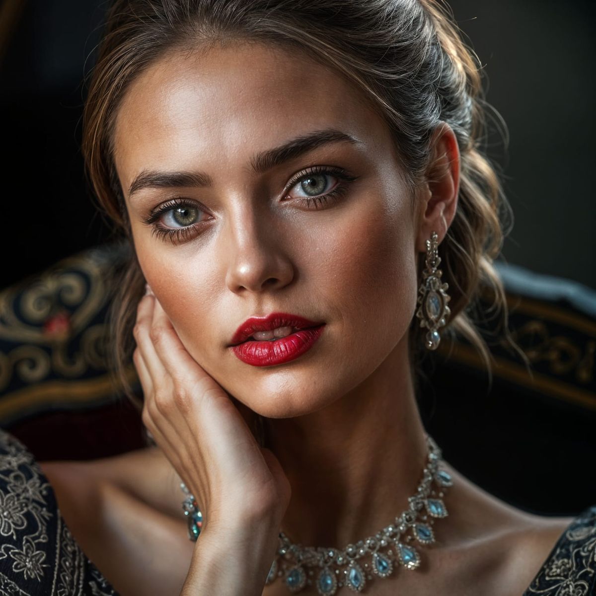 This hyperrealistic portrait features a gorgeous woman with striking red lips, captured with intricate detail, sharp focus, and high contrast for a cinematic feel.