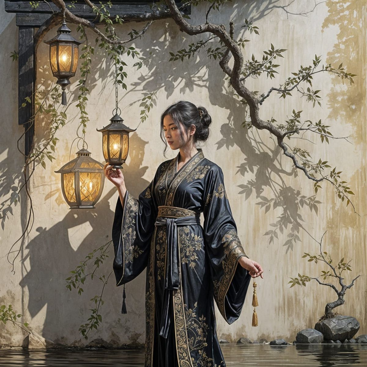 This image shows sfumato sketches with a black, silver, and gold color scheme reminiscent of traditional Chinese painting. The artwork features a mystical figure and scenes with flowing robes and lanterns.
