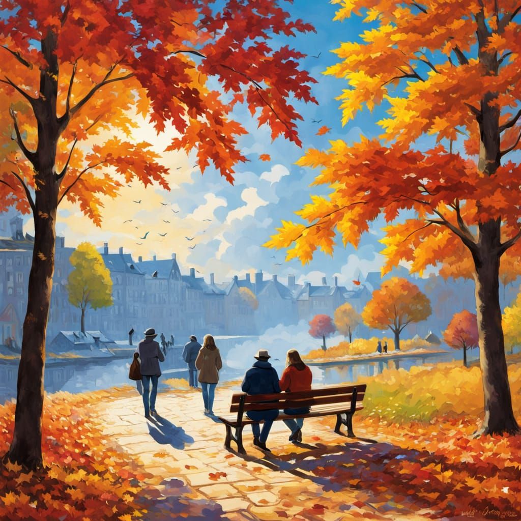 This image depicts a heartwarming autumn day in a park, featuring vibrant foliage, a clear blue sky, and people enjoying conversations on a bench and walking.