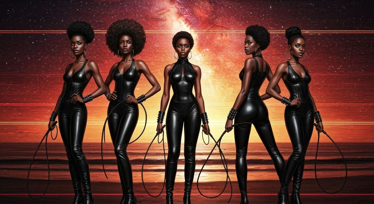 This image depicts four tall African women in black leather with whips, standing on a beach at sunset. A galaxy blends into the sky, with glitch effects and dark fantasy realism.