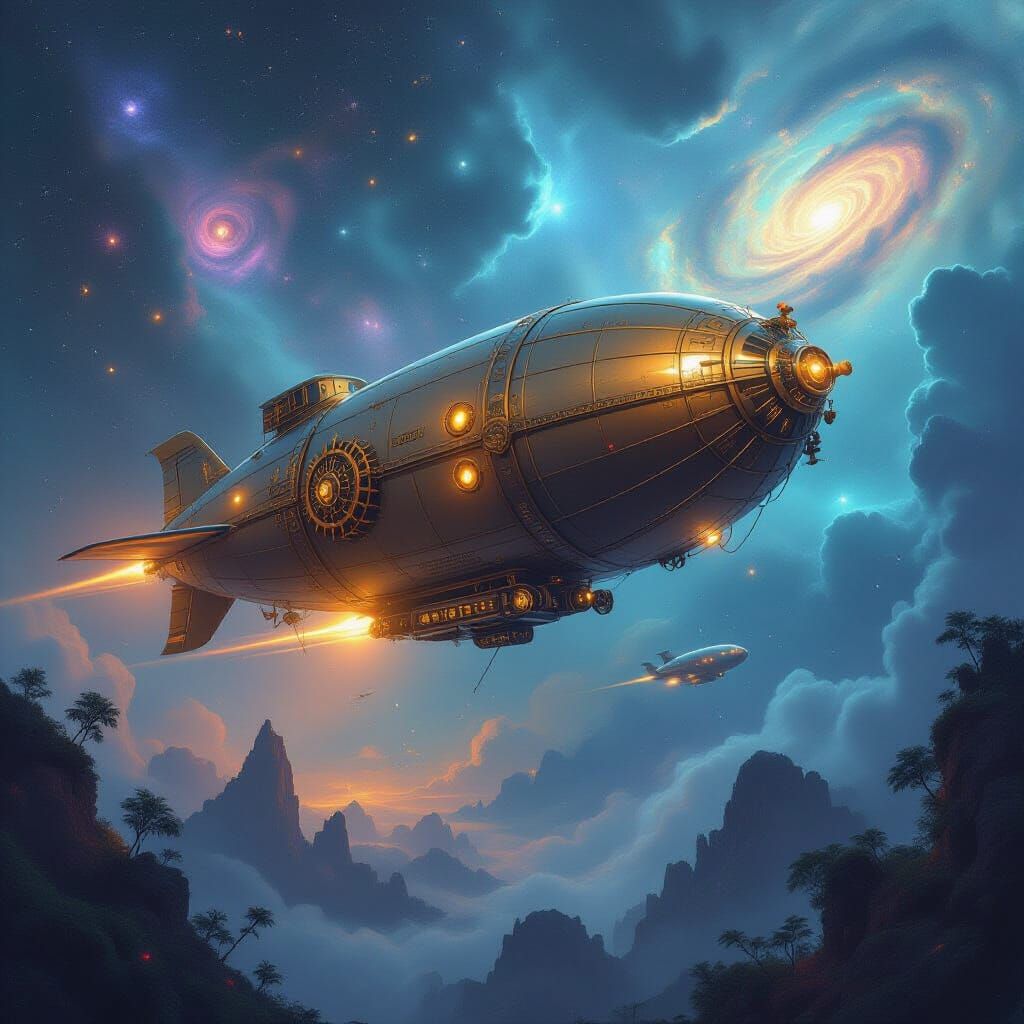 A highly detailed digital painting depicts a majestic steampunk airship floating through a vibrant nebula, with glowing lights and bioluminescent plants below.