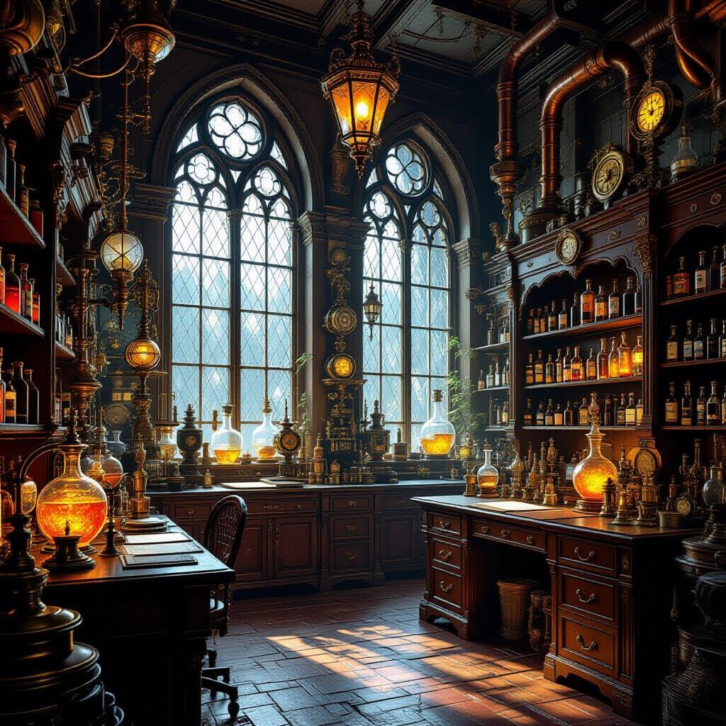This image depicts a detailed steampunk laboratory with brass instruments, glowing vials, and gothic windows. Intricate mechanical contraptions and alchemical elements create a mysterious, Victorian-inspired atmosphere.