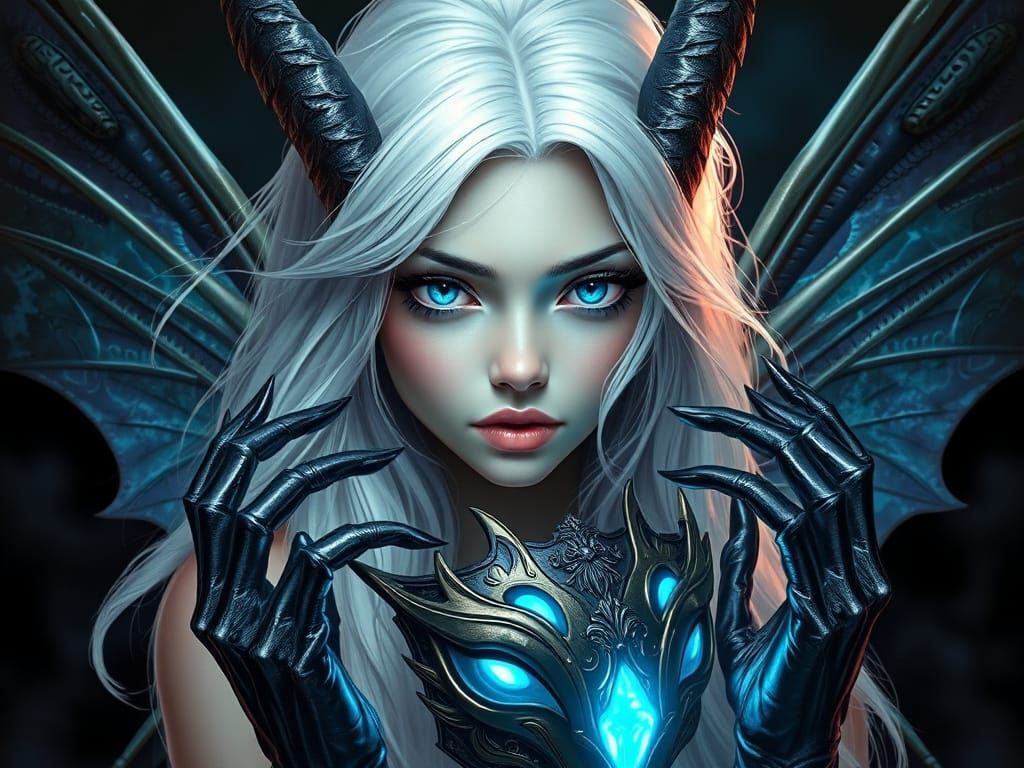 This image shows a striking, hyperrealistic digital painting of a metal fairy with flowing white hair, piercing blue eyes, and glowing skin, set against a dark backdrop with deep shadows, surrounded by intricate details and a silver color scheme, reminiscent of cyberpunk and dark fantasy art.