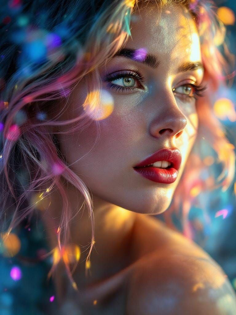 A striking picture of a face seen through a crystalline filter, creating delicate rainbow edges. The image has a surreal aesthetic, with fluid ink splatter textures and soft-focus glowing effects.