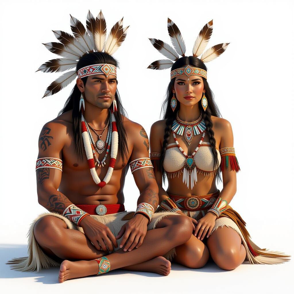 This image shows an Aboriginal man and woman in traditional clothing. The man is sitting while the woman stands next to him. The image is rendered in highly detailed 3D with photorealistic textures.