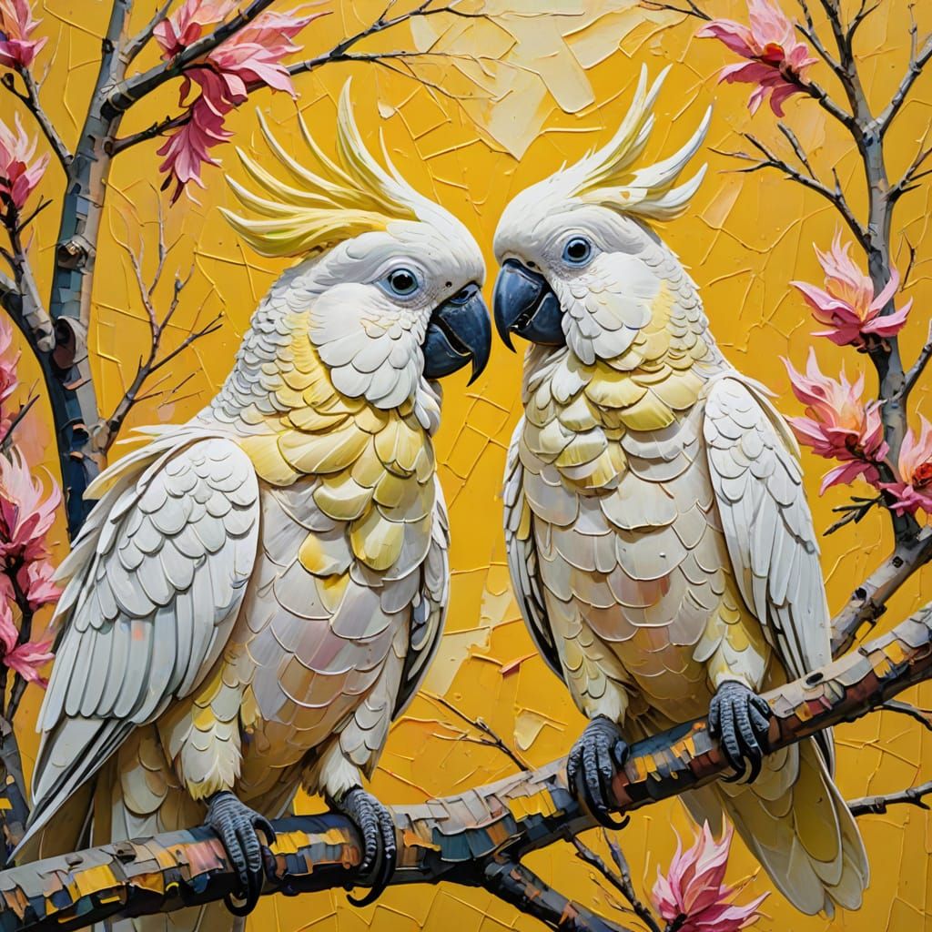 A vibrant impasto painting of two sulfur-crested cockatoos perched closely together on a tree branch. The image focuses on the birds' textured feathers with thick brushstrokes and a palette of lively, warm colors.