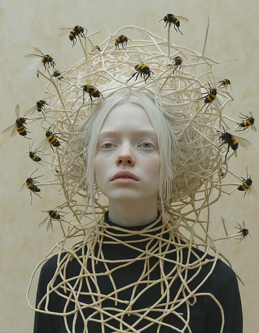 she's hollow mirrors on nature mock her embodied ivory-white hair like scaffolding holds a series of recursive wild mirrors climbing up and around her bunched hair-strands in layered hollowness reflecting the futility of right now pull back into a wide angle wild angle full-length long shot mirroring ...