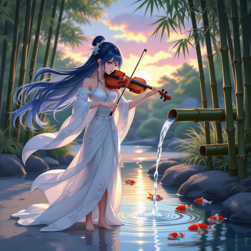 This image shows a serene Japanese garden with a bamboo water spout. Koi swim in a pond beneath lily pads, with a thatched-roof pavilion visible in the background. The scene is bathed in soft sunlight.