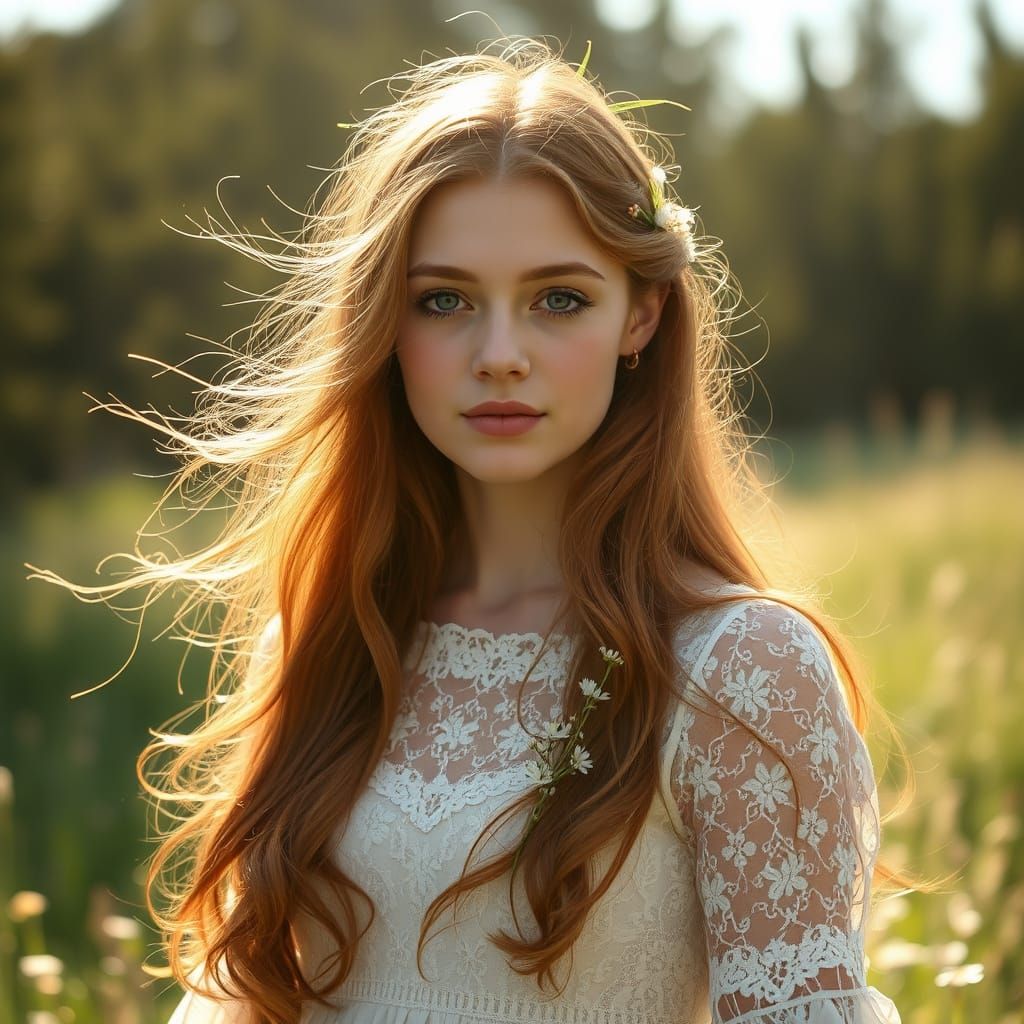 A striking picture of a serene young woman with auburn hair, wearing a vintage lace dress and wildflowers, standing in a sunlit meadow. The image evokes Pre-Raphaelite paintings.