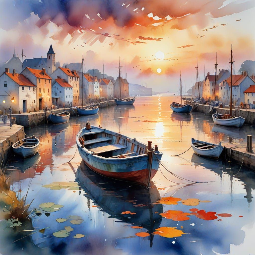 A watercolour image of a fairy tale scene with an old boat in a harbor at sunset. This artwork blends delicate watercolour techniques with cinematic stylization.