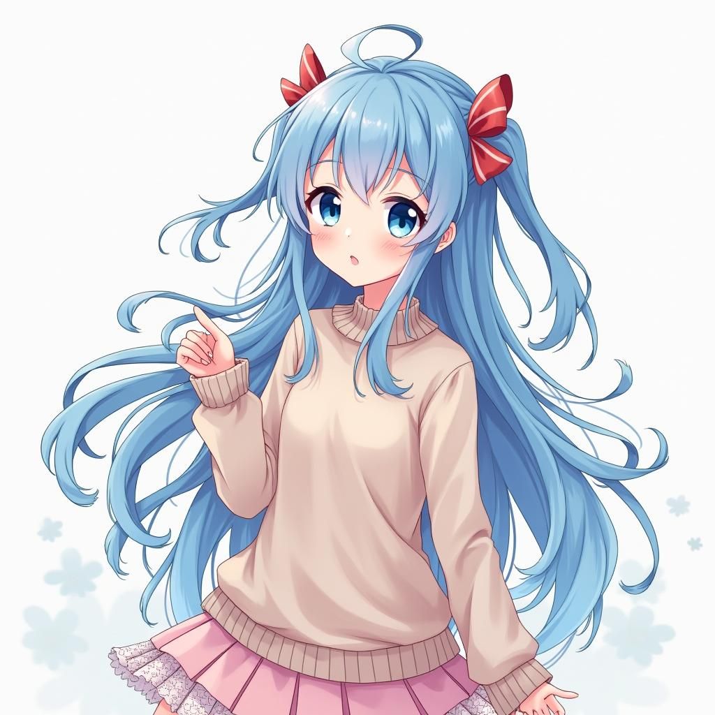 This image shows a beautiful anime girl with striking blue eyes and flowing sky-blue hair. She is wearing a pastel sweater, pleated skirt, and ribbon accessories in a vibrant, stylized digital art style.