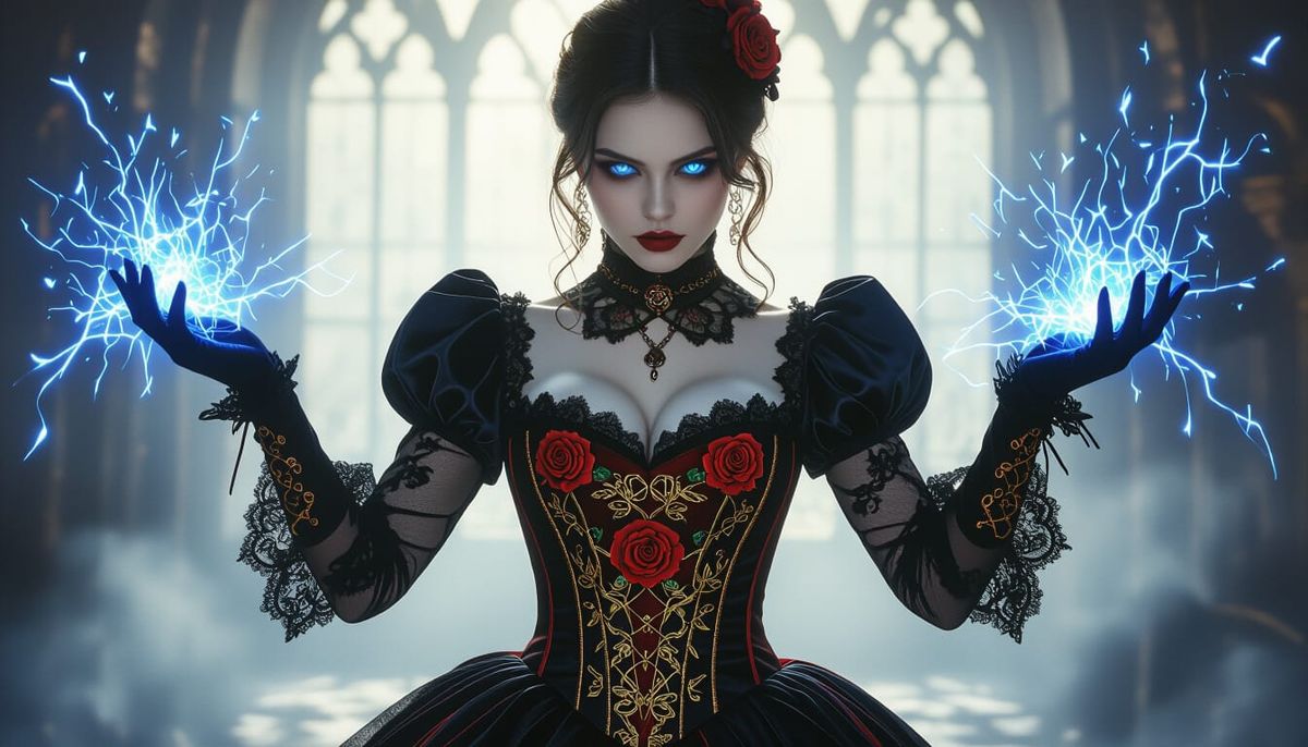 A stunning young female vampire stands in the grand hall of a gothic cathedral, her black lace Victorian corset dress embroidered with vivid red and gold roses and thorns. Her glowing royal blue eyes blaze with supernatural intensity, crackling with arcs of blue fire. Both hands radiate with sparking royal and deep blue energy, native the the Savante' bloodline, the air shimmering as her power builds. Dim ambient light and strong side key lighting cast dramatic shadows across the intricate lace and embroidery, while a faint mist swirls around her, giving the scene a cinematic, otherworldly atmosphere.