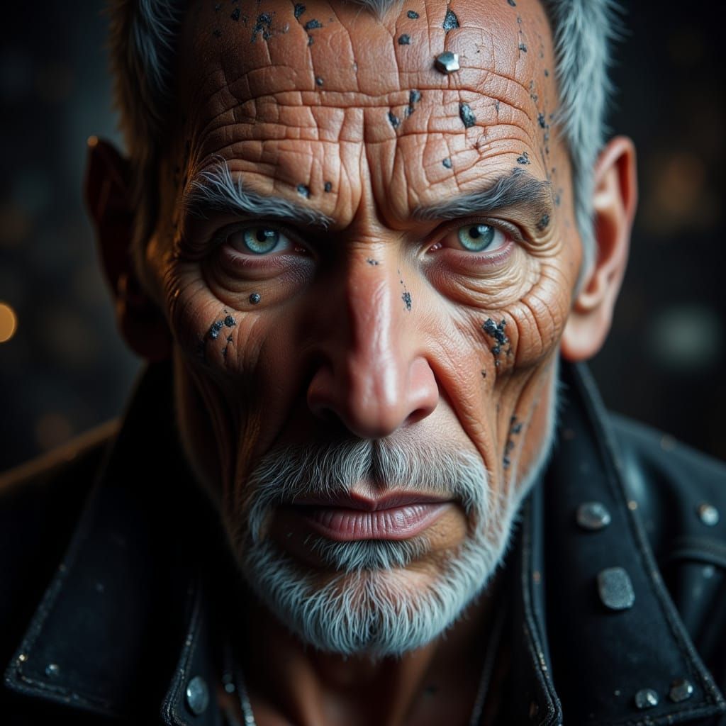 This image is a close-up, photo-realistic portrait of a middle-aged man with subtle jewelry, captured with sharp focus and studio lighting. The background has a bokeh effect.