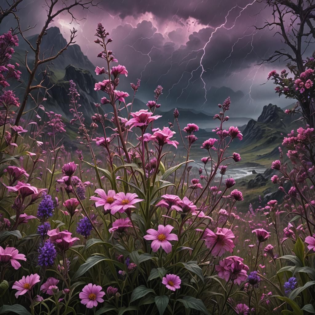 A dramatic digital matte painting of pink and purple wildflowers under a stormy sky. The image has a cinematic and ethereal fantasy aesthetic.