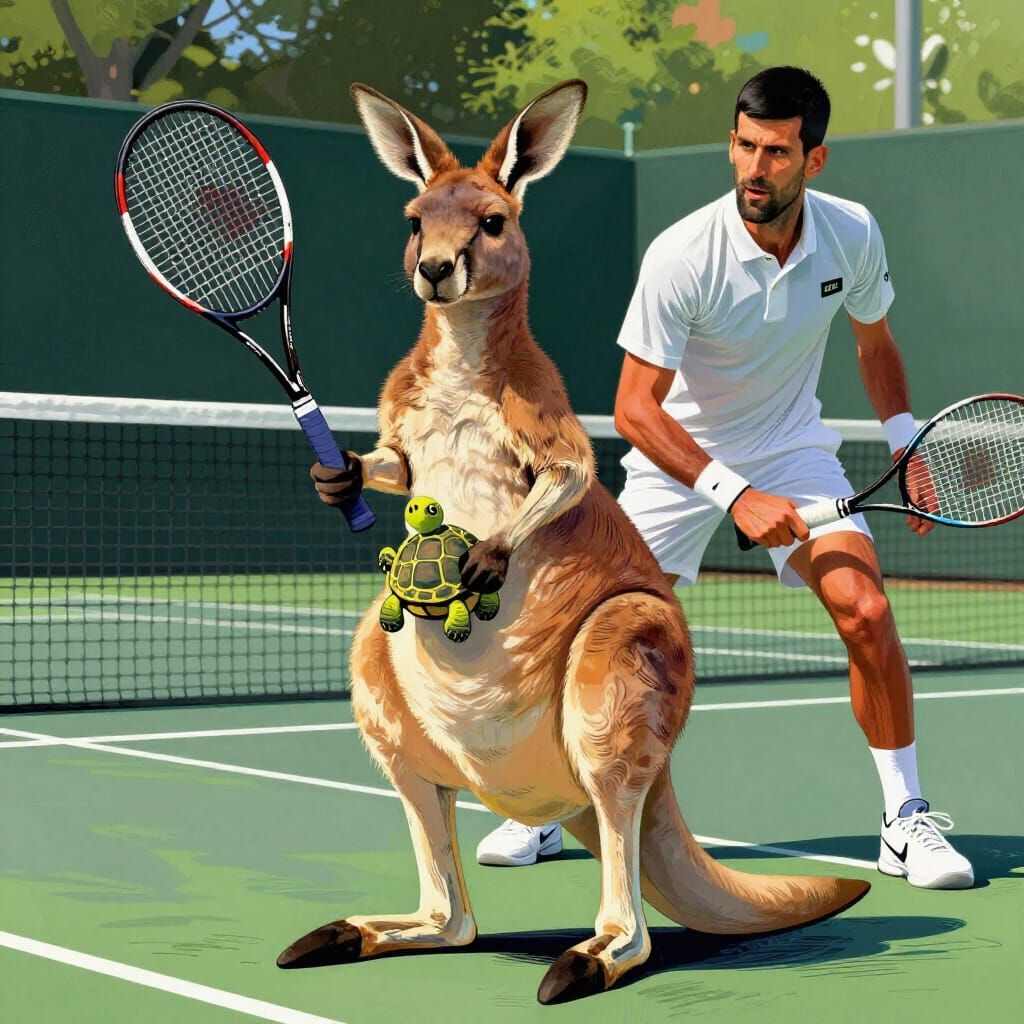 This vibrant digital painting shows a kangaroo with a baby turtle in its pouch, holding a tennis racket, facing Novak Djokovic on a sunny court. The art features bold lines and dynamic lighting.