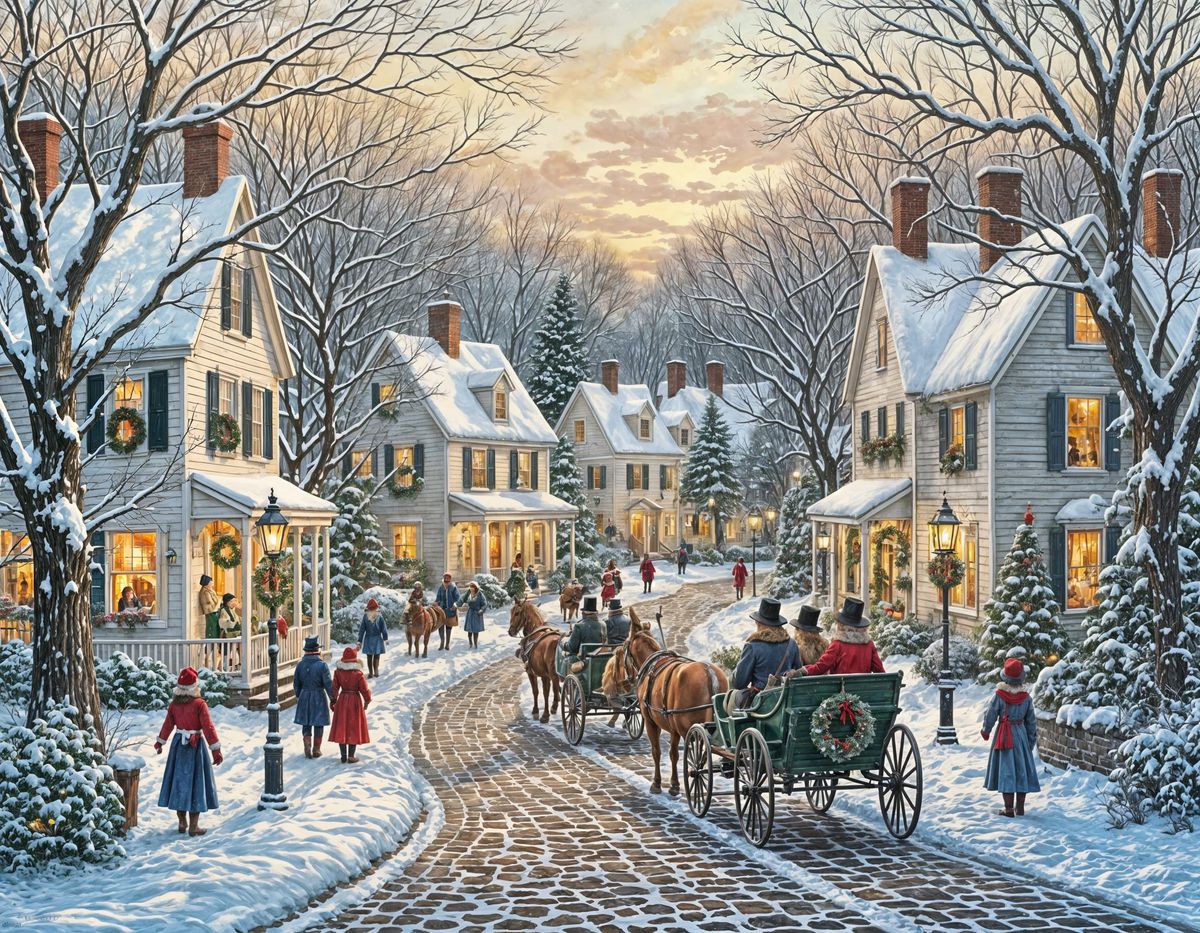 This image shows a quaint 1800s New England village scene at Christmas. A cobblestone street is lined with snow-dusted buildings and horse-drawn carriages, in a Thomas Kinkade inspired watercolor style.