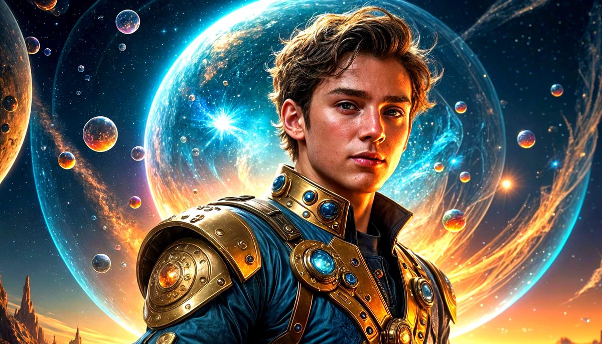 This image showcases a futuristic space dancer in a vibrant, detailed scene. The artwork features a young man with striking features, surrounded by a richly textured environment with a mix of futuristic and nostalgic elements, creating a captivating and immersive atmosphere.