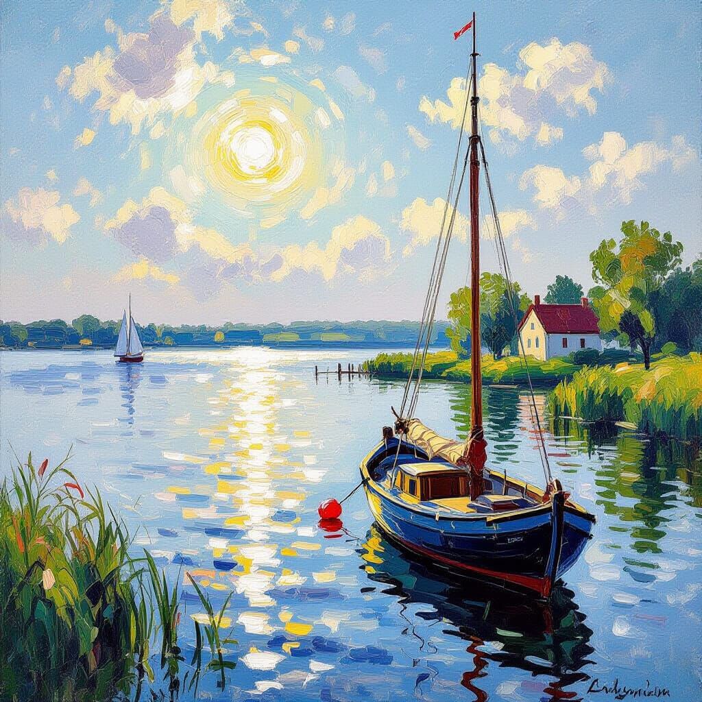 This image shows Müritzsee bathed in bright sunlight, with glistening water. It is rendered in an impressionist oil painting style, featuring vibrant colors and distinct brushstrokes for a serene atmosphere.