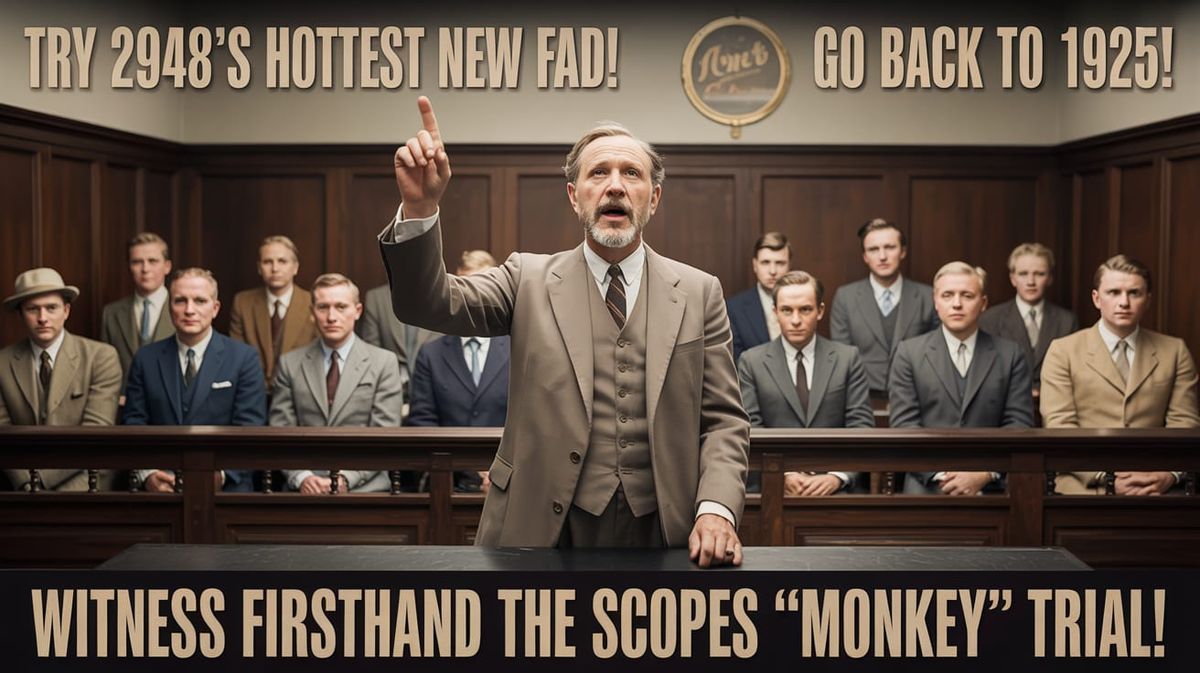 A 1950’s style Travel Poster advertising the Scopes “Monkey Trial”. The image shows a 1920’s courtroom, full of older men. Standing at the front, between the Judge’s bench and the Defedant’s table is a distinguished looking older man with a beard, wearing an old fashioned 3 piece suit. His mouth is ...