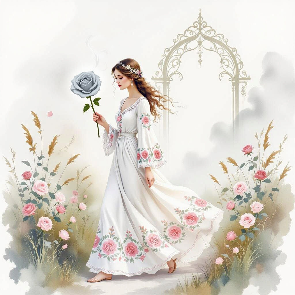 This image shows a young Ukrainian woman in traditional dress, walking through a misty field. The ethereal watercolor painting style evokes a melancholic, Slavic fairytale mood with delicate details and soft colors.