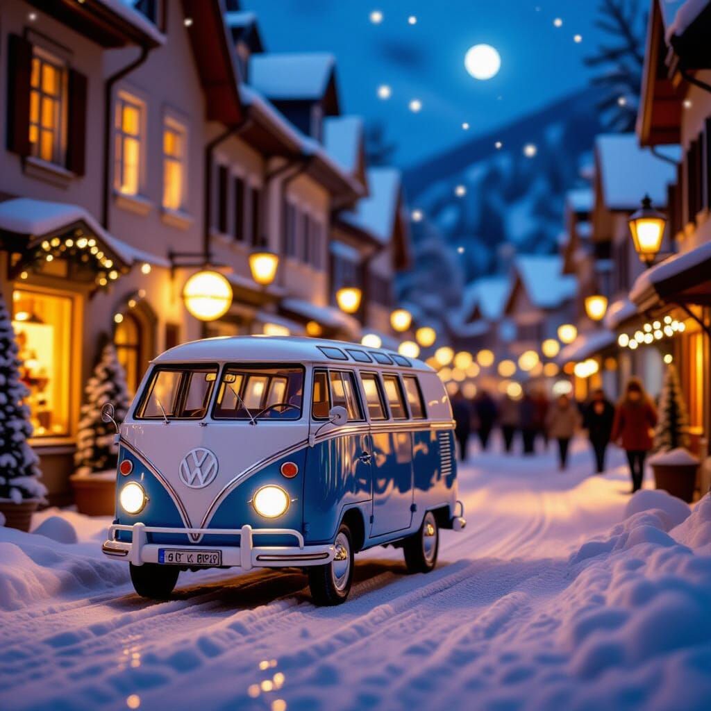 A cinematic wide-angle photo of a bustling European Christmas village street at dusk, featuring a vintage blue VW bus and warm lights in snowy windows. Captured with painterly realism and deep depth of field.