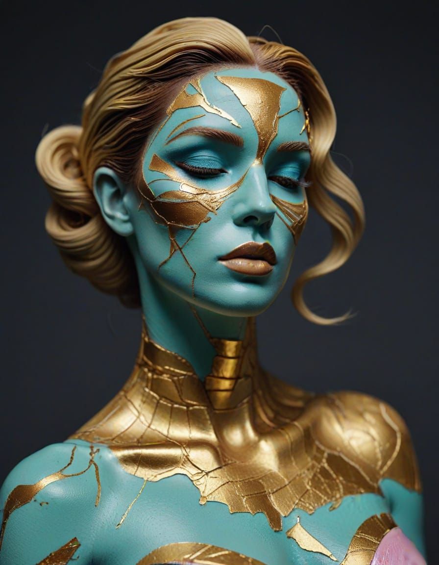 A digital image of a Venus De Milo statue in drag queen makeup. The statue is in pastel colors and has kintsugi elements, creating a flawed yet golden beauty in a Dadaism style.