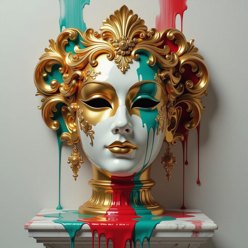 A striking picture of a gold and marble theatrical mask on a pedestal. The mask features detailed carvings that blend into dripping oil paint in crimson, teal, and ivory, in a surreal style.