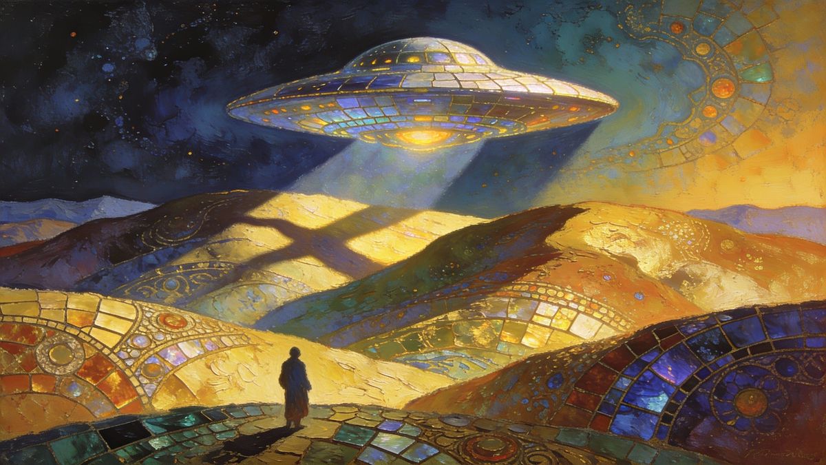 This image shows a glowing alien spacecraft above a rolling hills landscape, rendered with impasto and stained glass textures in rich jewel tones and golden hour light.