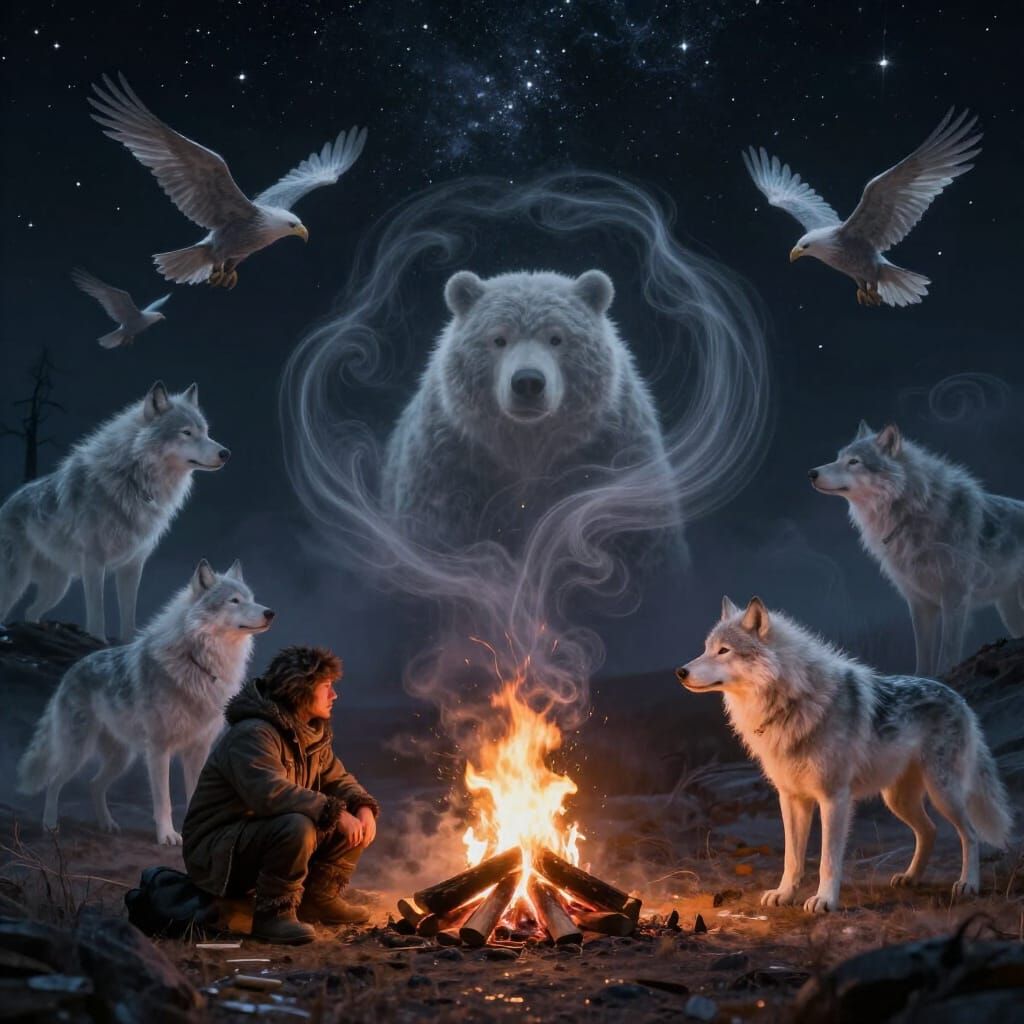 This image shows an Inuit man by a campfire at night, with ghostly spirit animals forming in the smoke. Rendered in a fantasy concept art style with intricate detail and deep colors.