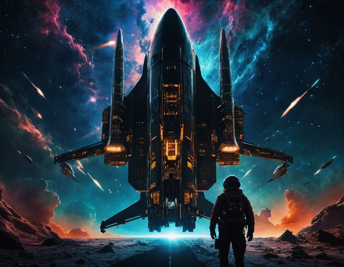 This image shows a sleek spaceship silently flying through a colorful nebula. The pilot is silhouetted against the cosmic background in a cinematic style, reminiscent of a film still with dramatic lighting and color grading.