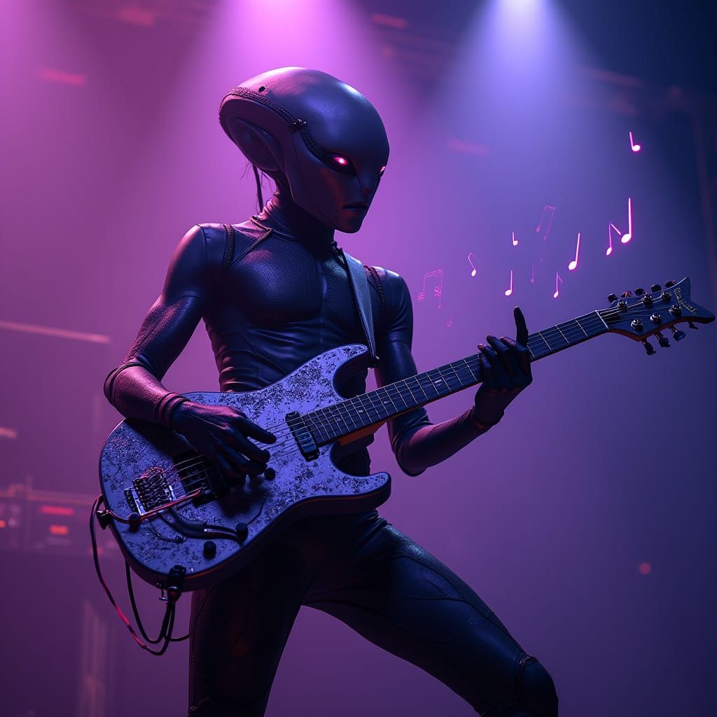 This image shows an extraterrestrial musician performing on a brightly lit stage. The alien has glowing eyes and wears a futuristic suit, playing an electric guitar with holographic notes in a cyberpunk aesthetic.