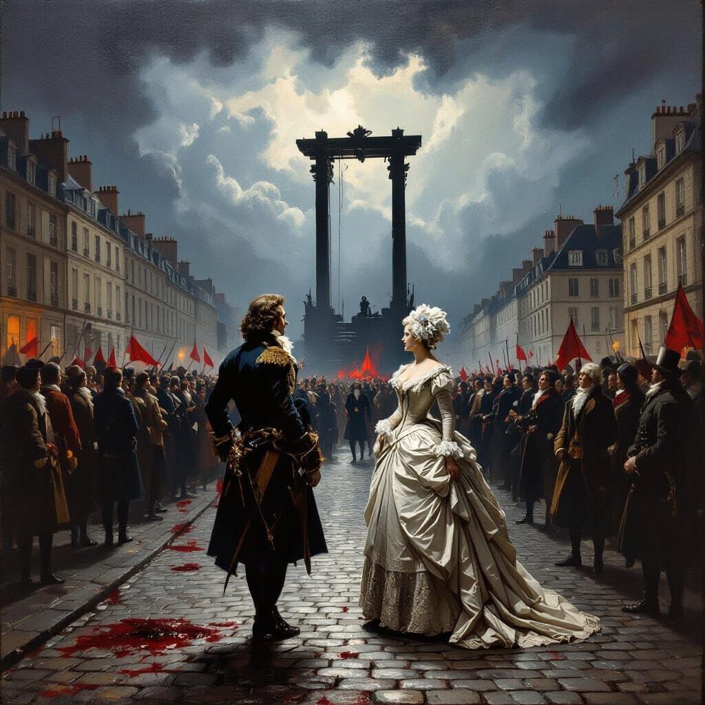 A dramatic oil painting depicts Louis XVI and Marie Antoinette amidst the French Revolution, with a guillotine and stormy sky. Rendered with deep shadows and stark highlights, conveying tragic historical weight.