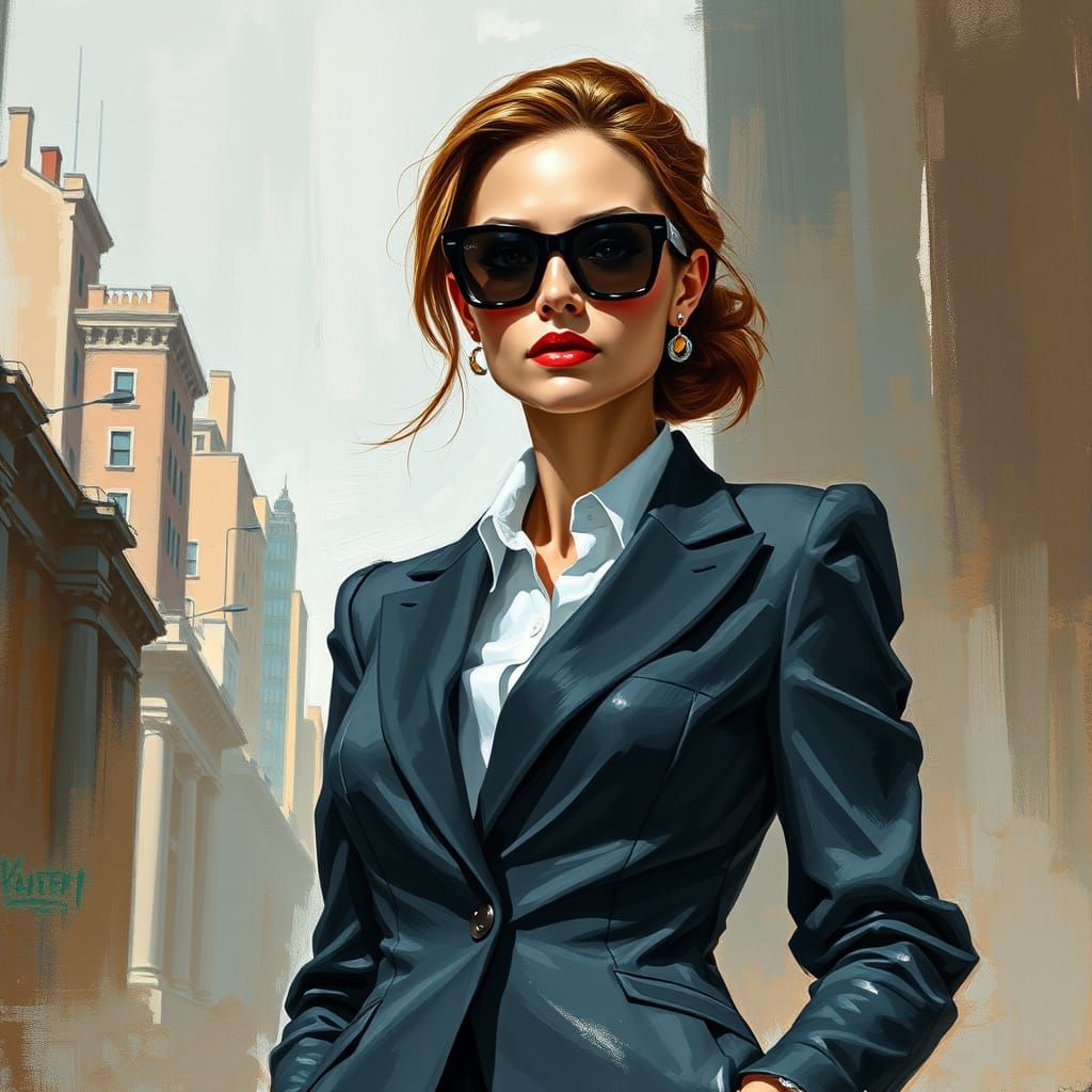This image shows a confident woman in a business suit, leather gloves, and sunglasses. Thick brushstrokes emphasize fabric textures with a painterly realism style and an abstract cityscape.