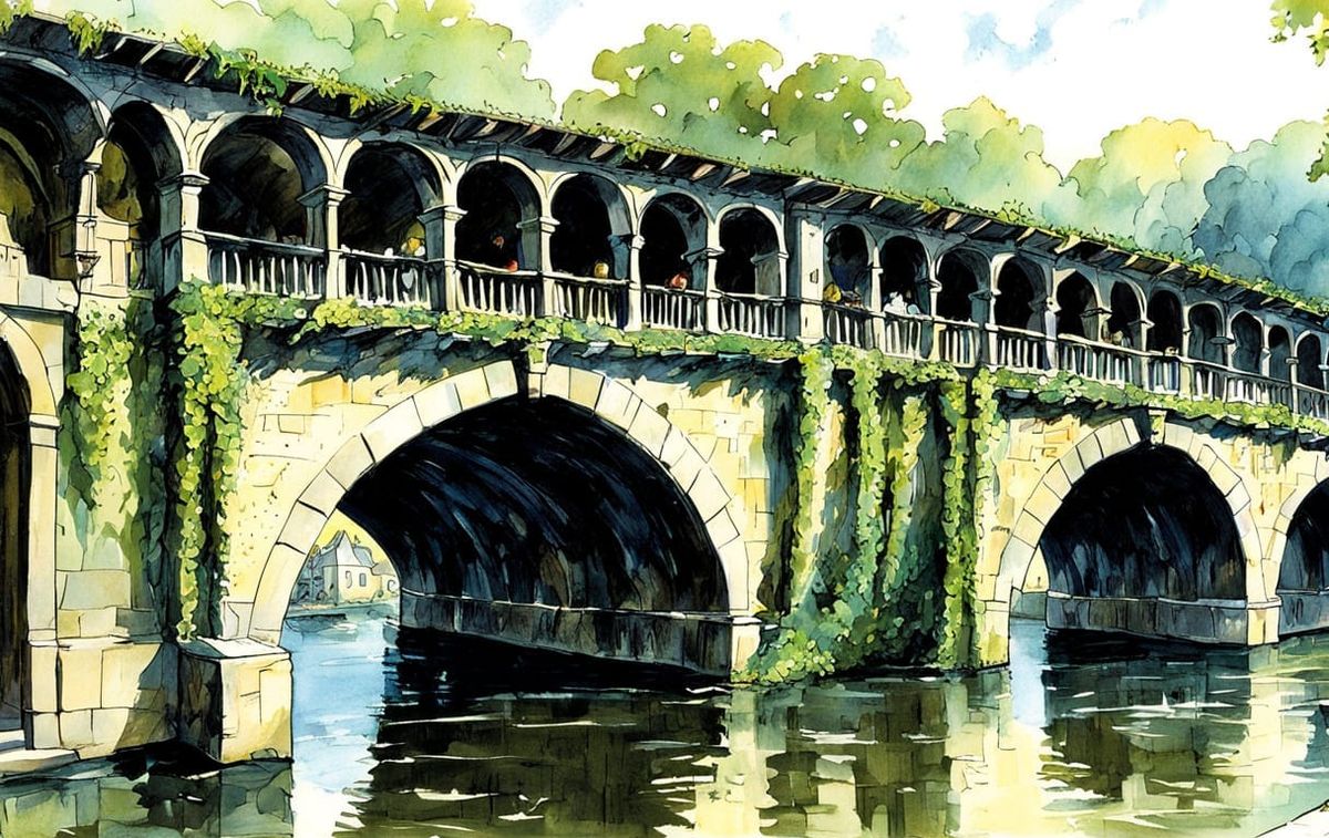 A magnificent stone bridge spanning a misty river gorge at golden hour, with an entire medieval villa, based in one of my drawings,