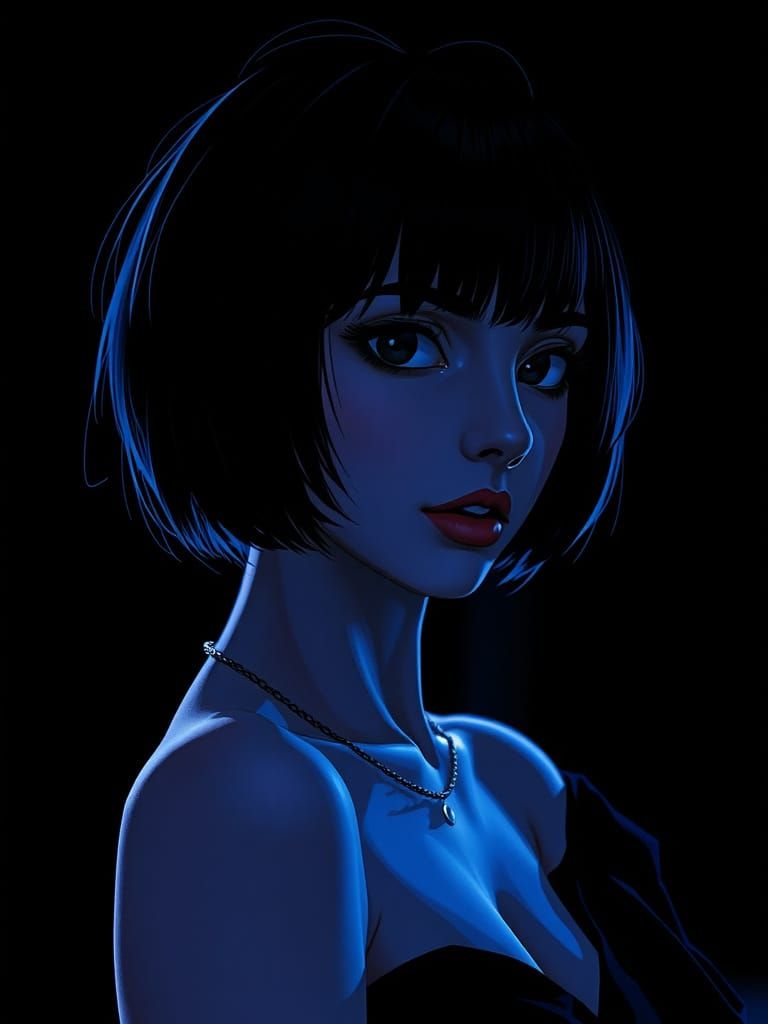 This intense portrait showcases a mysterious woman in a dramatic, high-contrast setting. A blend of dark blues, purples, and blacks creates a captivating atmosphere, while subtle film grain and shading add depth and texture.