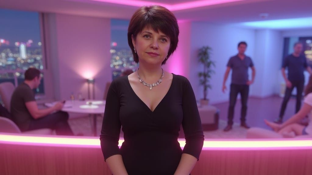 This image shows a modern woman with short dark hair and a curvy figure, dressed in a stylish black dress and necklace, standing in front of a TV. The artwork is 3D rendered digital art.
