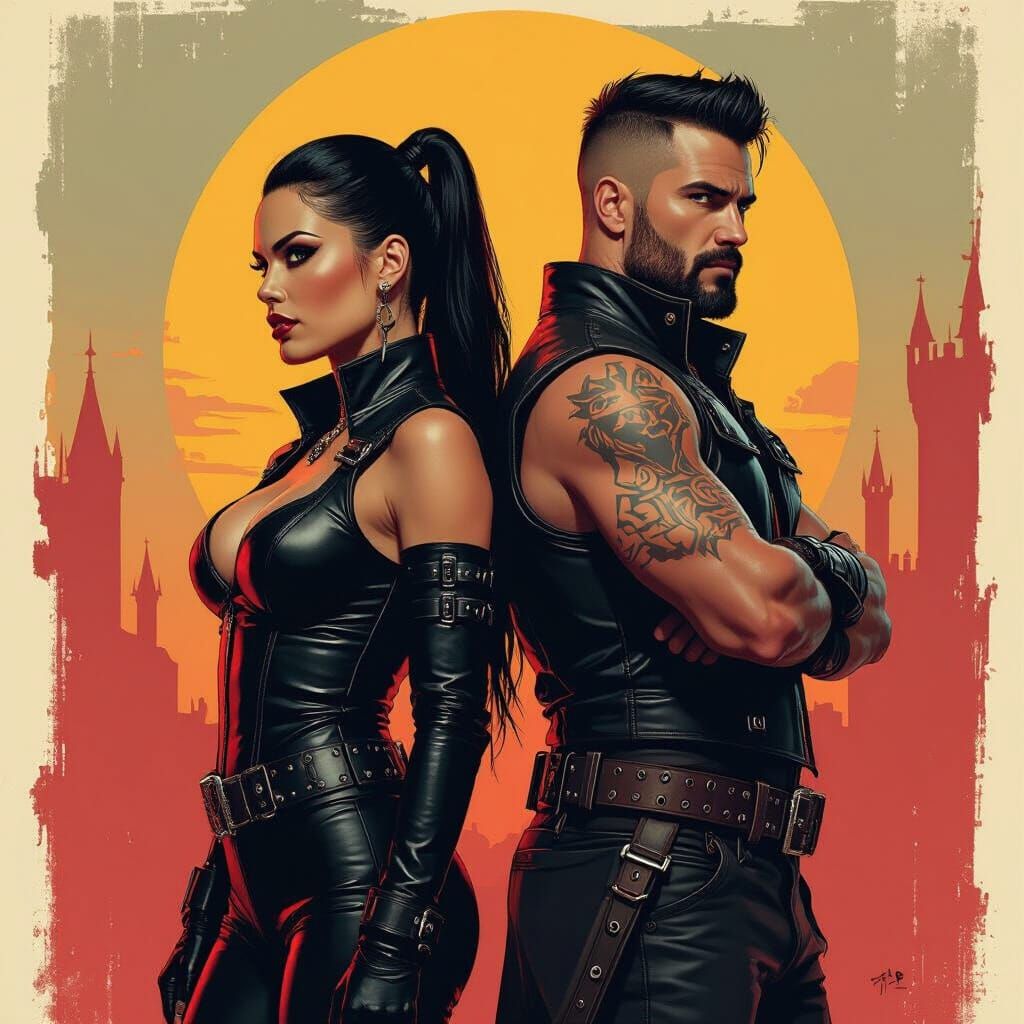 This image depicts a powerful woman in dominatrix leather attire and a gay leather daddy standing back to back. The abstract poster style features bold lines, vibrant colors, and dramatic lighting.