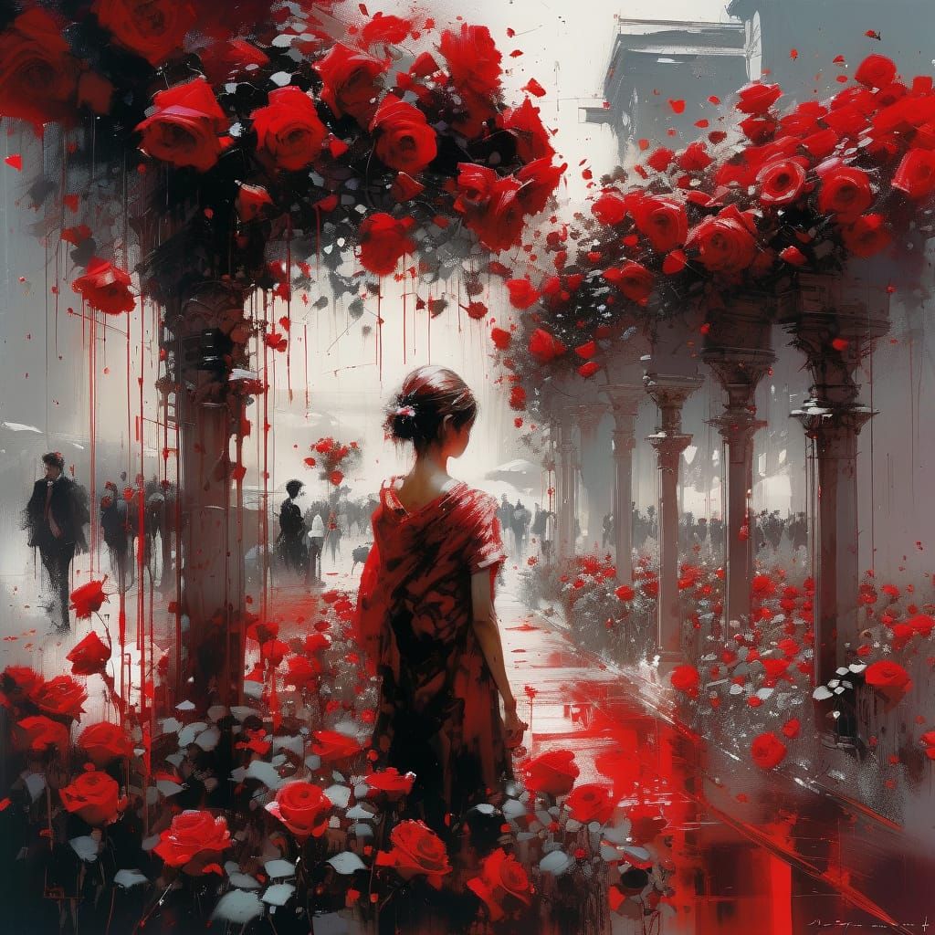 This image showcases a detailed oil painting of a vast garden filled with hundreds of red roses, featuring dramatic lighting and sharp focus in a fine art style.