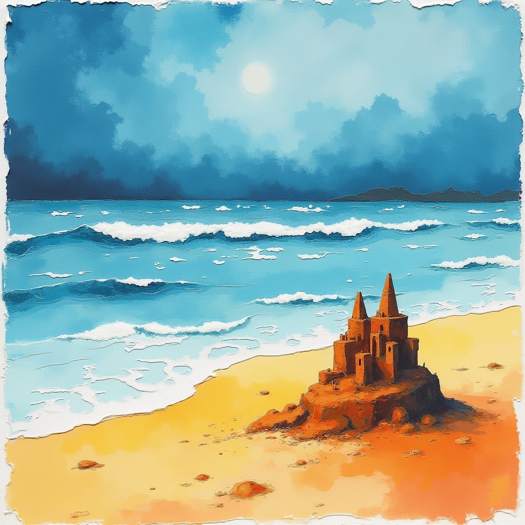 A minimalist abstract collage of a sandcastle on a beach. The image features ink stains, dynamic colors, and a moody color palette, with an azure sky in constructivist style.