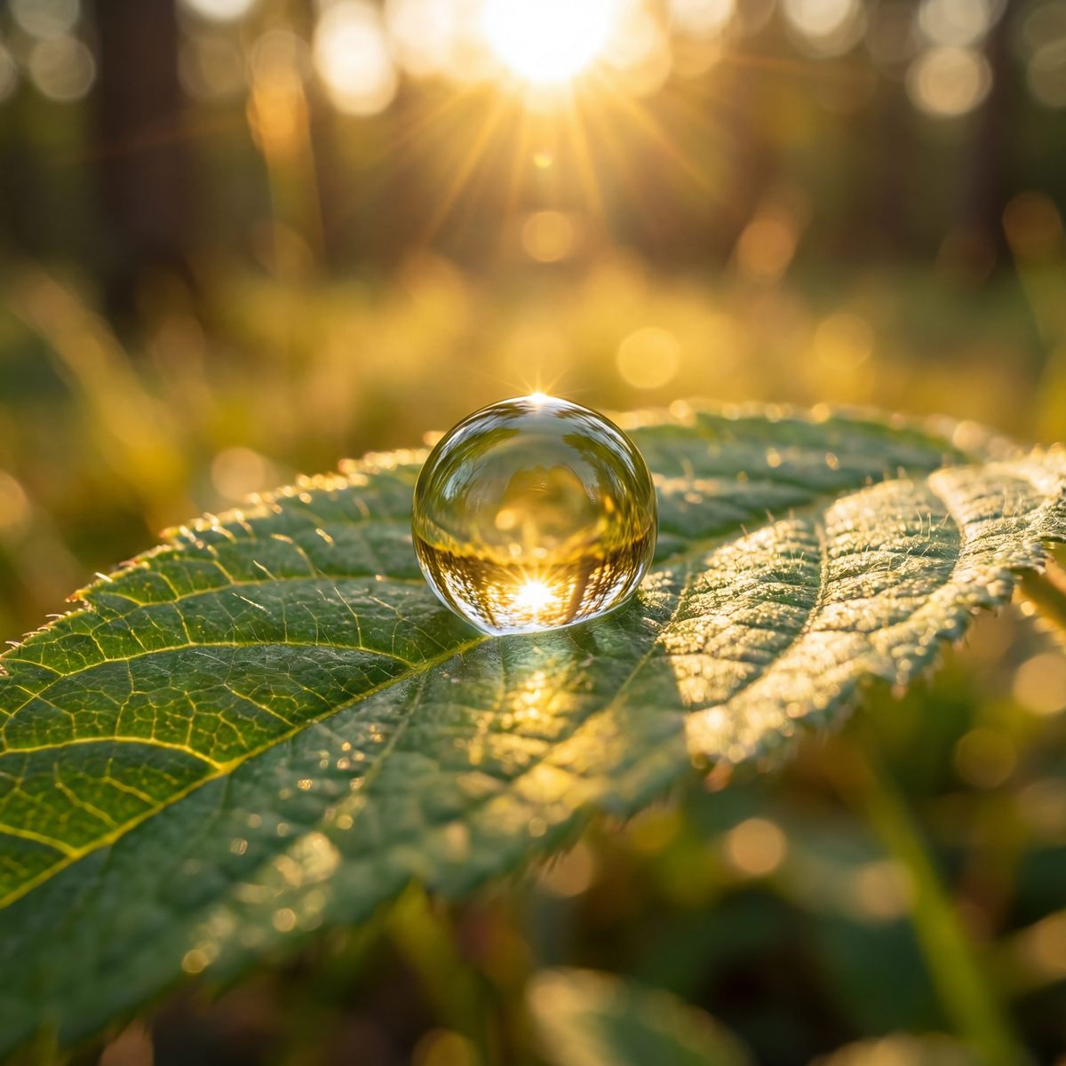 A photorealistic image of a single, perfectly formed dewdrop on a vibrant green leaf, catching the early morning sun, with a shallow depth of field and a gentle bokeh background. Golden hour lighting, macro lens, 8k resolution, hyperrealistic detail, vivid colors.