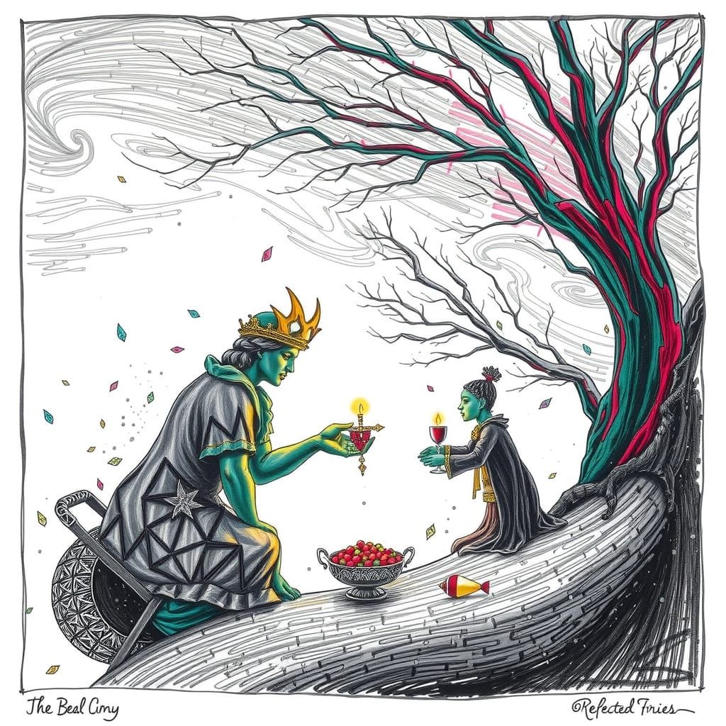 This image showcases a hyperrealistic sculpture bathed in intense, dynamic light. It features intricate textures and a striking palette of red, green, yellow, black, and white.