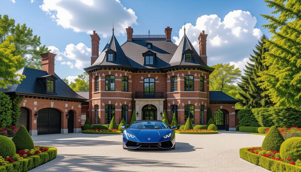 A grand Victorian chateau with a navy Lamborghini parked outside in a vibrant summer garden. Captured with painterly textures and rich hues, evoking elegant realism.