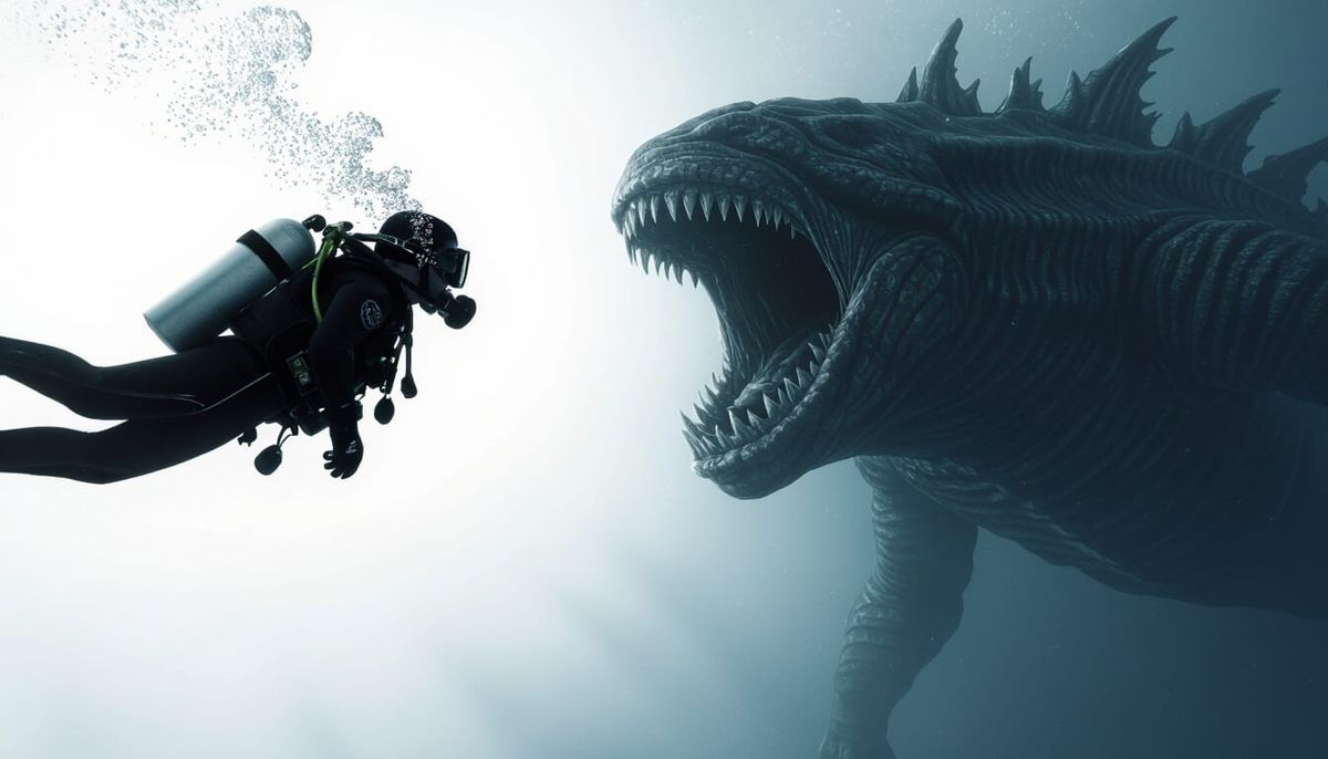 This image shows a first-person view of a diver meeting a giant sea creature in the dark ocean depths. It captures a moment of awe and terror.