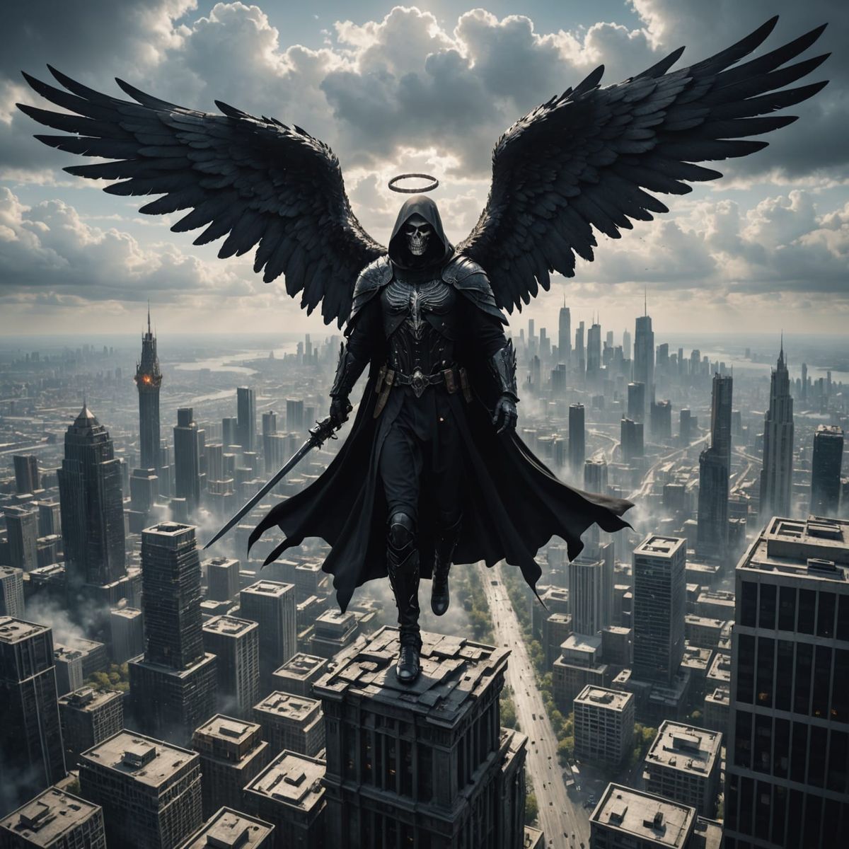 Unleash your creativity with our free AI image generator - easily create dark fantasy scenes like 'Angel Of Death Looking At The City Below'!