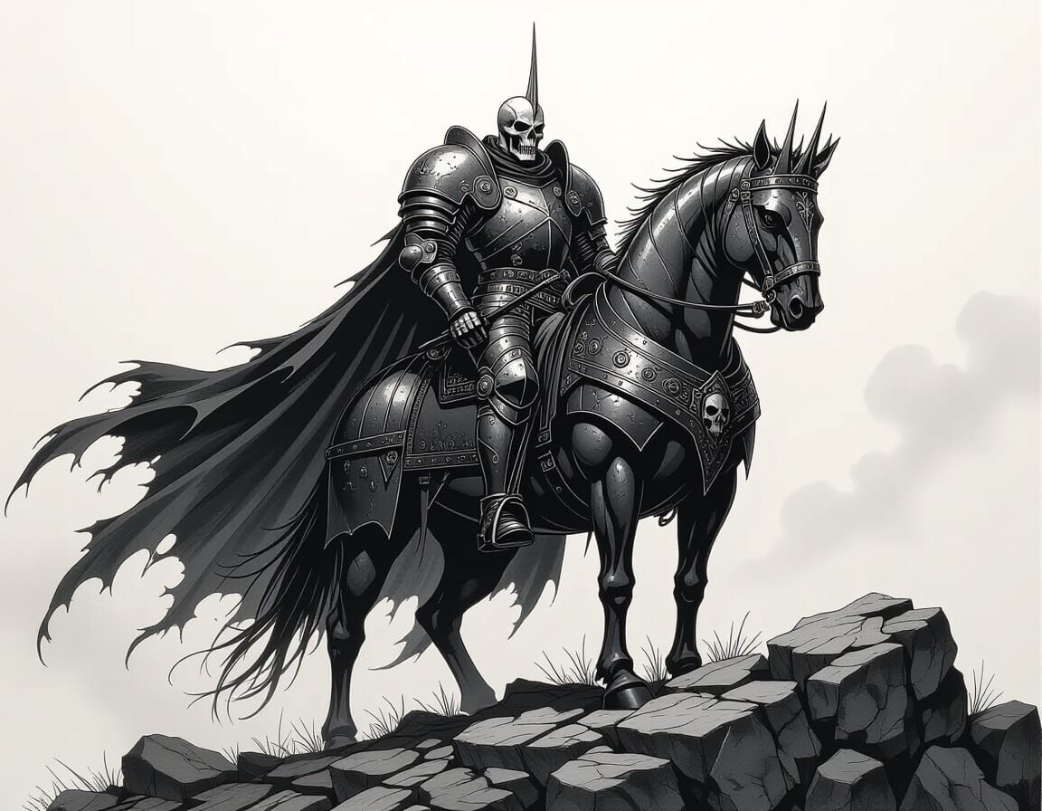 A striking picture of a dark, armored warlord with a skull face, mounted on a powerful armored horse atop a rocky hill. The image is rendered as a hyperdetailed charcoal drawing in a black and white manga style.