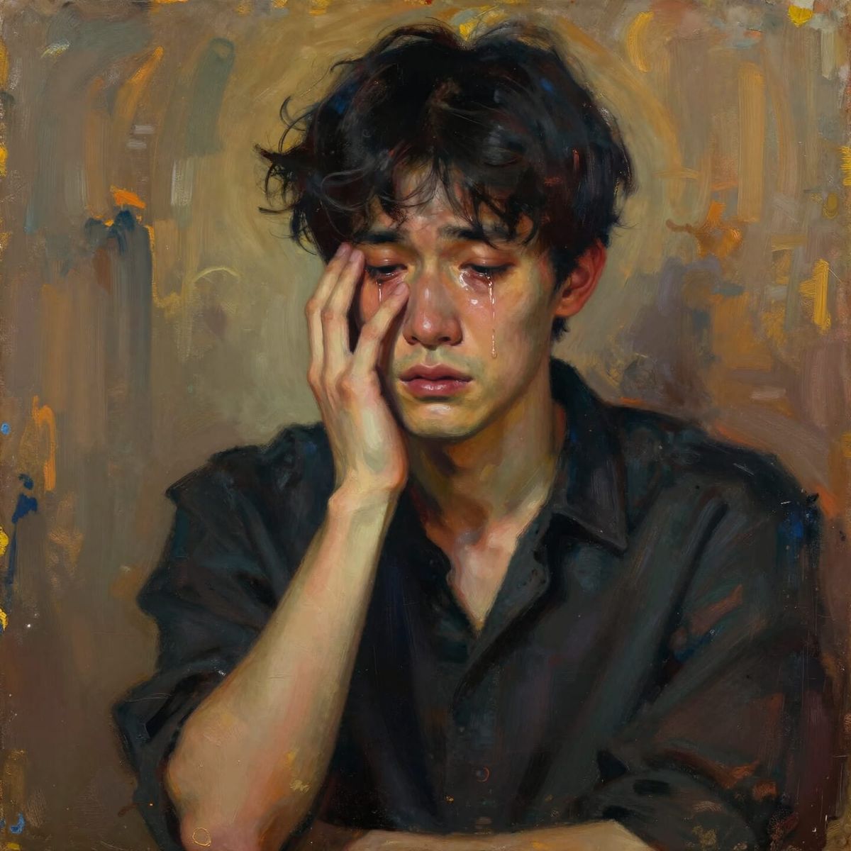 This image captures a deeply sad androgynous Asian man with flowing tears, presented in a psychologically charged style reminiscent of Pavel Tchelitchew and Gaston Bussière.