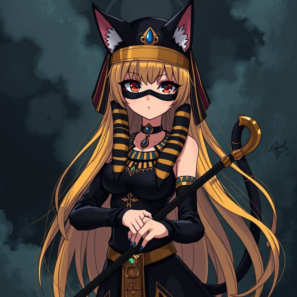A striking image of a mystical anime girl with a cat tail and black eyemask, surrounded by a dark, mystical atmosphere, featuring vibrant, bold lines and intricate details in a cyberpunk aesthetic.