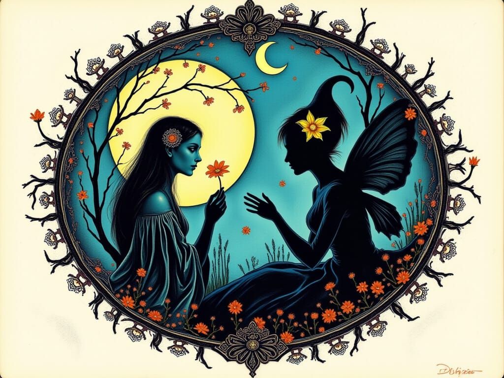 Design your own enchanting filigree silhouettes inspired by Mozart's The Magic Flute with our free AI art generator.