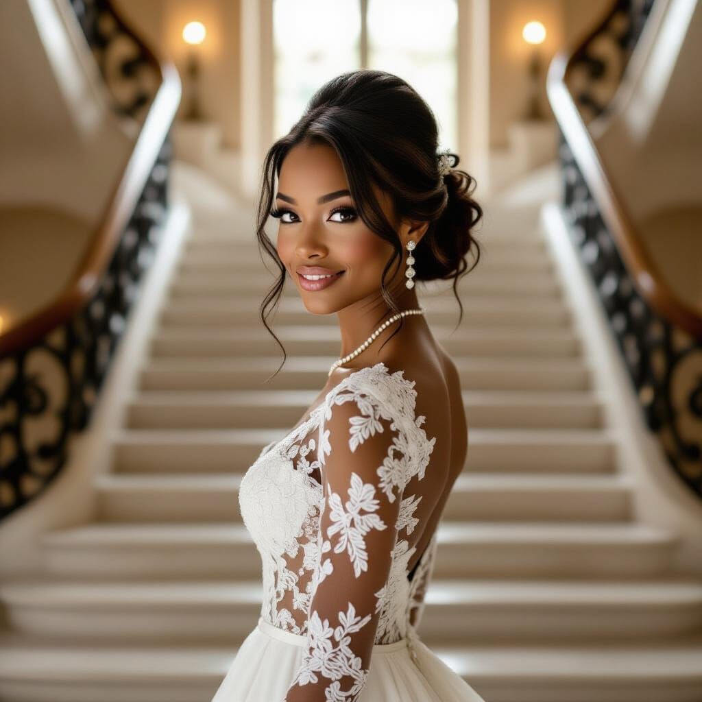 A petite black woman in a white lace wedding dress and pearl necklace walks down a grand staircase. Captured in fine art photography with soft, romantic lighting.